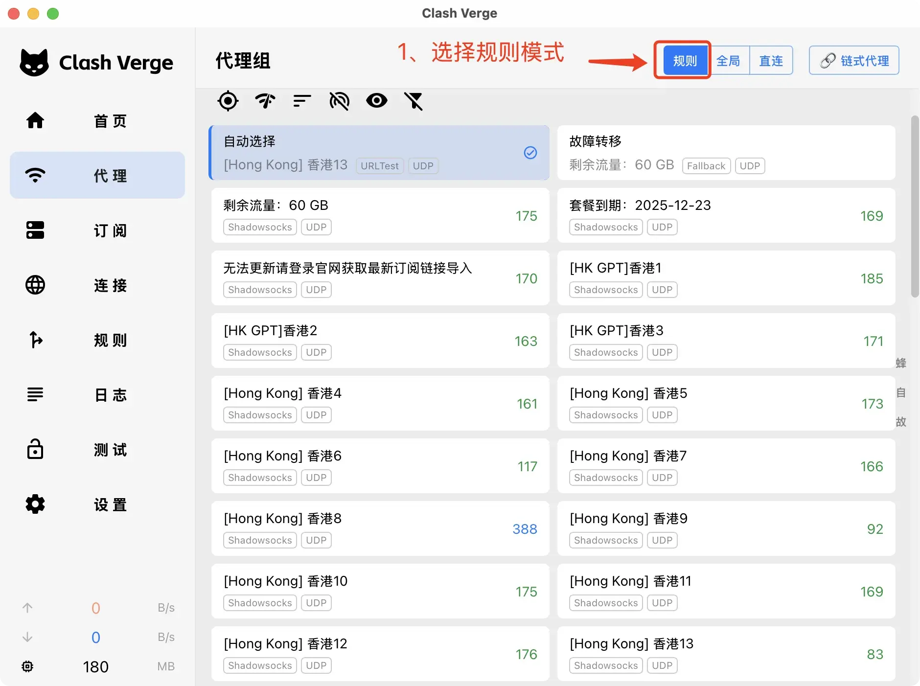 - 直接:此模式将忽略所有节点,所有流量都不会通过代理。 通常情况下,选择"规则"模式即可。然后单击选择一个代理节点。