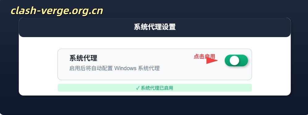 在 Clash Verge Rev 界面顶部,找到系统代理开关,点击启用。启用后,Windows 系统会自动配置代理设置。